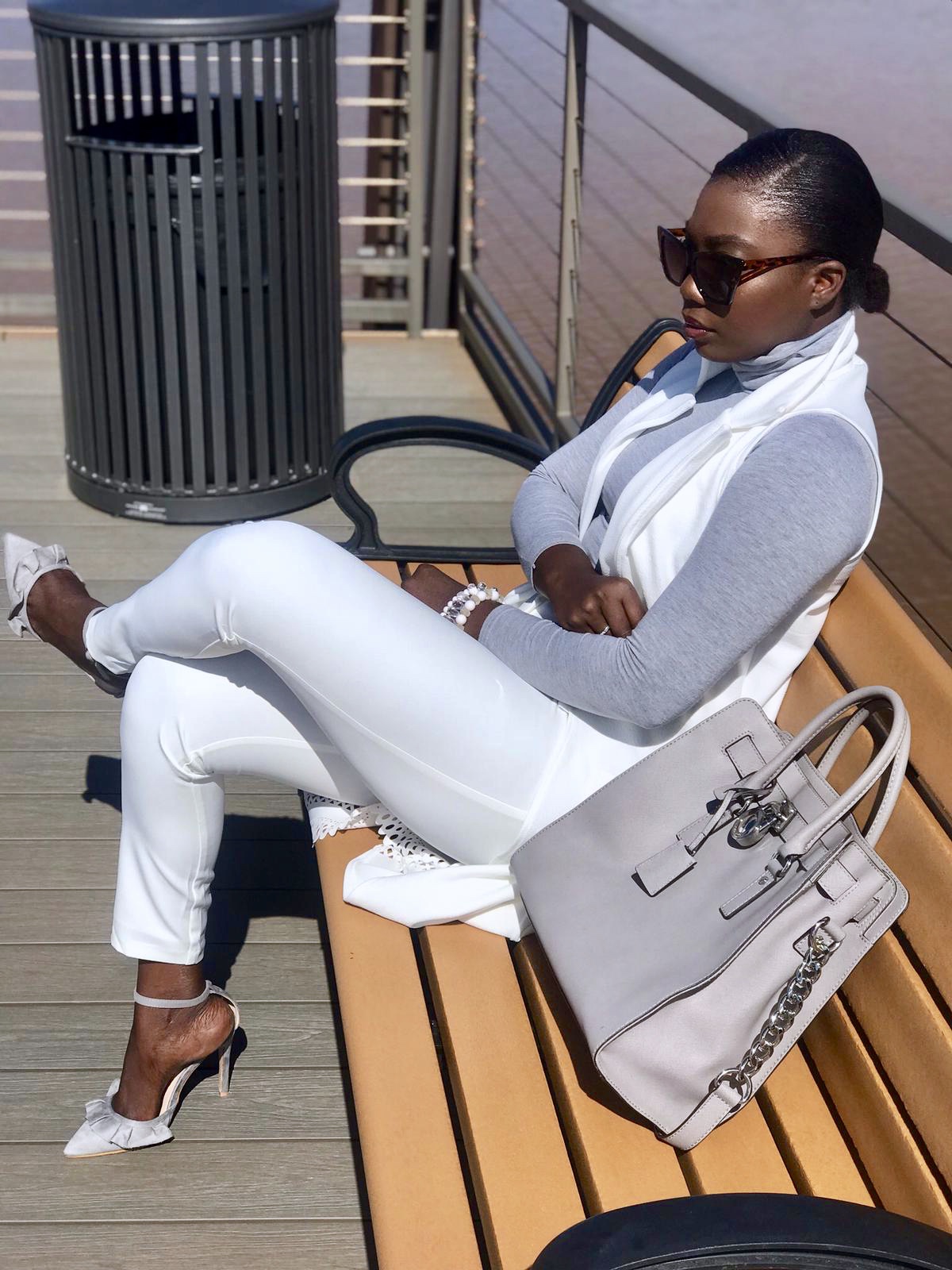 Hello beautiful people and thank you for reading Priscastyleme <3! Today’s look is a classic all white + grey mix. I’m all for wearing white no matter what season it is. White adds a nice and clean look to anything you wear; that’s why I never hesitate to create looks that involve wearing white pieces. I am wearing a pair of white high-waisted cigarette pants with a grey roll neck long sleeve bodysuit. I honestly Lovee the quality of this bodysuit; very thick cotton-ish material that makes you feel really warm. I would be wearing it during extremely cold days with just a coat on top of it and it would be warm enough. I added this cute sleeveless vest not only to add more white to the look, but also to nicely compliment it. Really loving this idea of rolling the collar of the vest which is what I did on top of the roll neck bodysuit. The final look it gives is never disappointing ;). I picked these pointed ruffle heels and my Michael Kors Hamilton to accessorize. I love how this look is patterns/prints – free and color -free but look so classy and neat! Also, it’s always best to layer a longline vest or blazer over a high-waisted pants/jeans because it looks way much better than wearing something shorter! All Outfit details are down below 😉