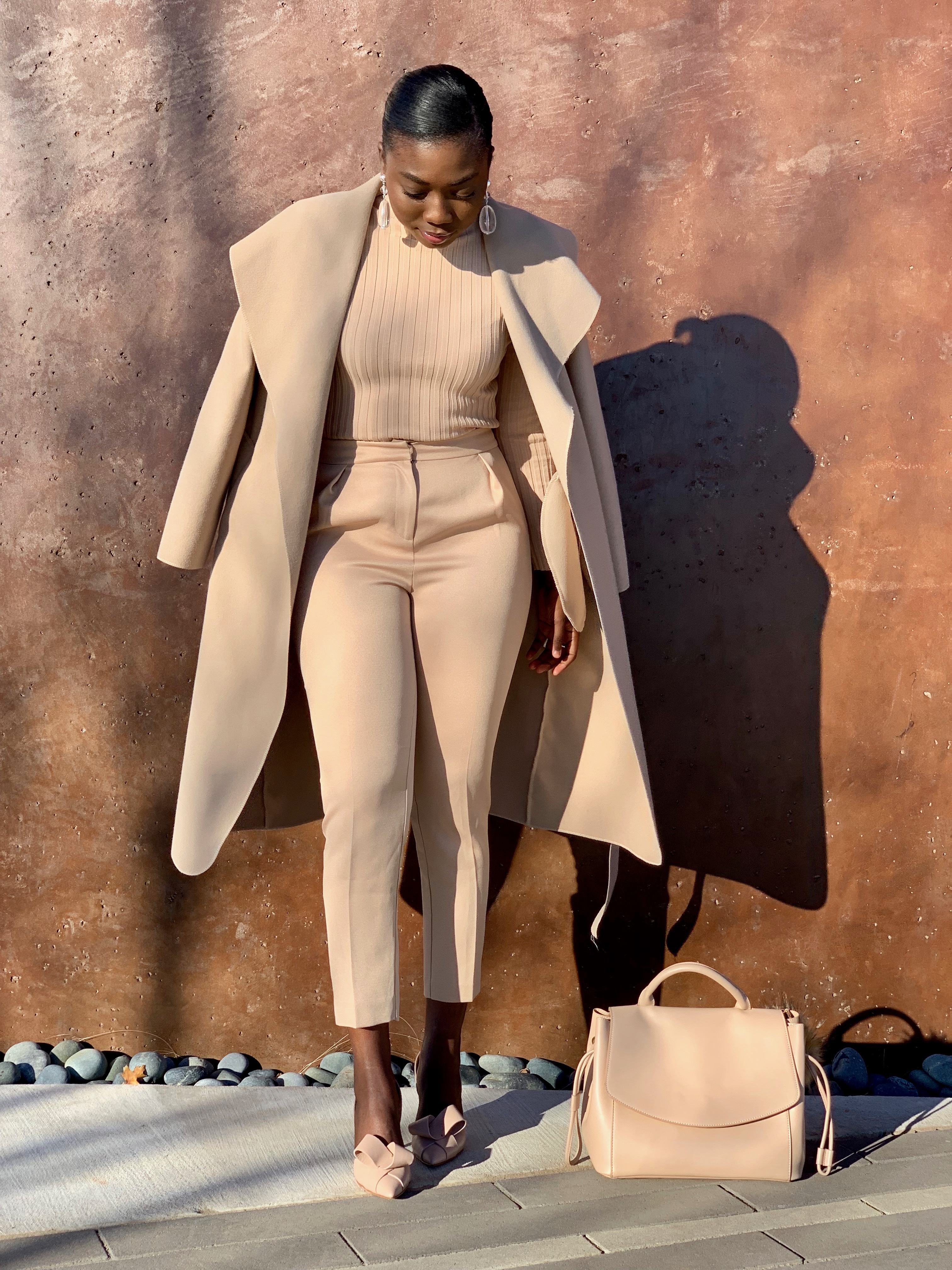 Well I’m extremely excited to be back on PriscaStyleme to bring you more style inspirations! My first Look of 2019 is this monochromatic nude color look. I’m always happy to wear this color because as plain as it looks it always make you look elegant and classy. It will never go out of style because of its neutral feature so I never hesitate to add nude color pieces into my wardrobe. Investing in neutral pieces will never let you down trust me 😉 It took me a minute to realize that but I’m glad I finally did :D. I paired this knit high neck top with a pair of cigarette pants which I Loveee the cute pleated details at the waist. Complimented the look with a wide lapel wool coat and a classy plain handbag. Unlike what a lot of people say about how not warm enough this coat is, it’s actually pretty warm to me. It’s by far my most worn coat! Finally to my favorite part of this look: THE SHOES!! Ahh these bow leather pumps are amazingly amazing! (yes you read that right haha). From the beautiful natural leather color to the mid heels and the so stylish bow, these shoes are on Fire!! They are extremely comfortable and I couldn’t help it but getting them in black patent too! I’m a firm believer of the say “if you love it, Buy it in different colors”. I will link these beauties for you guys to enjoy them too {FYI they are on a major sale right now 😉 }. ALL Outfit Details and today’s Bible verse are down below. Appreciate you guys for stopping by and read me! If you haven’t yet, you can subscribe to the blog by entering your email address and be notified Every time I post a new look!!