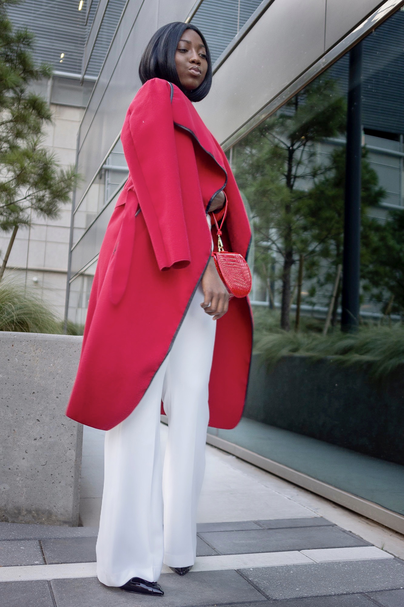 Happy Friday loves! Loving this pretty classy red and white look I pulled together for today’s post. Red is such a bold and eye-catching color that never fails to look amazing on every skin color tone. Color Matching the top and the outerwear is an easy tip that will allow you to look stylish and neatly dressed. This red knitted bodysuit (I totally recommend it!) and this waterfall coat was the perfect combination! Opted for a flared white trousers for the bottoms, to make the red pop even more. Now for such a look, a pair of pumps of color either nude, black, white or red would be a perfect pick! I decided to go with a pair of classic black patent pumps! To even up the red vibe of this polished look, a red croc mini bag would do it! You can never be or looked bored when choosing to dress elegant! All outfit details + more pics and bible’s verse are down below!
